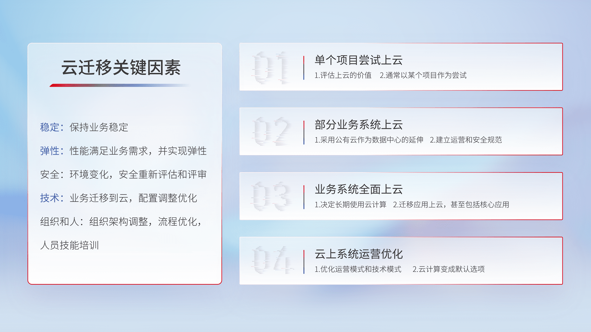 结合实际业务,,从规划设计、、云平台选型、、云原生改造、、、数据迁移、、、集成交付,,,,迁移全过程为客户识别最佳上云路径,,做好风险识别管理,,设计网络架构、、、、身份权限、、、安全审计合规、、、操作审计、、、、日志审计、、监控告警策略、、、多站点容灾设计等,,对云上基础设施进行整体规划,,提升IT治理水平,,以满足弹性、、、高可用、、高性能的需求。。。。